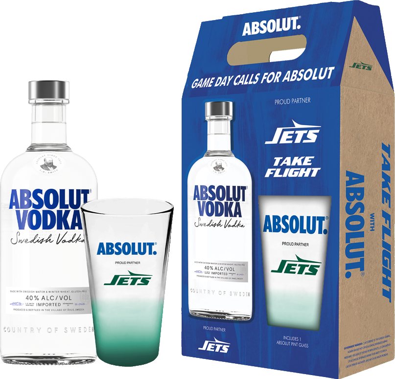 "Made from Swedish water and winter wheat . The mouthfeel is exceptionally smooth. Settling very peacefully it slowly descends in a harmonized way. The taste has slight hints of caramel and vanilla and the finish is fresh and fruity. It is the true definition of balance and harmony." Tasting Notes Gift set includes one 750ml bottle of Absolut Vodka and a commemorative Jets Pint Glass