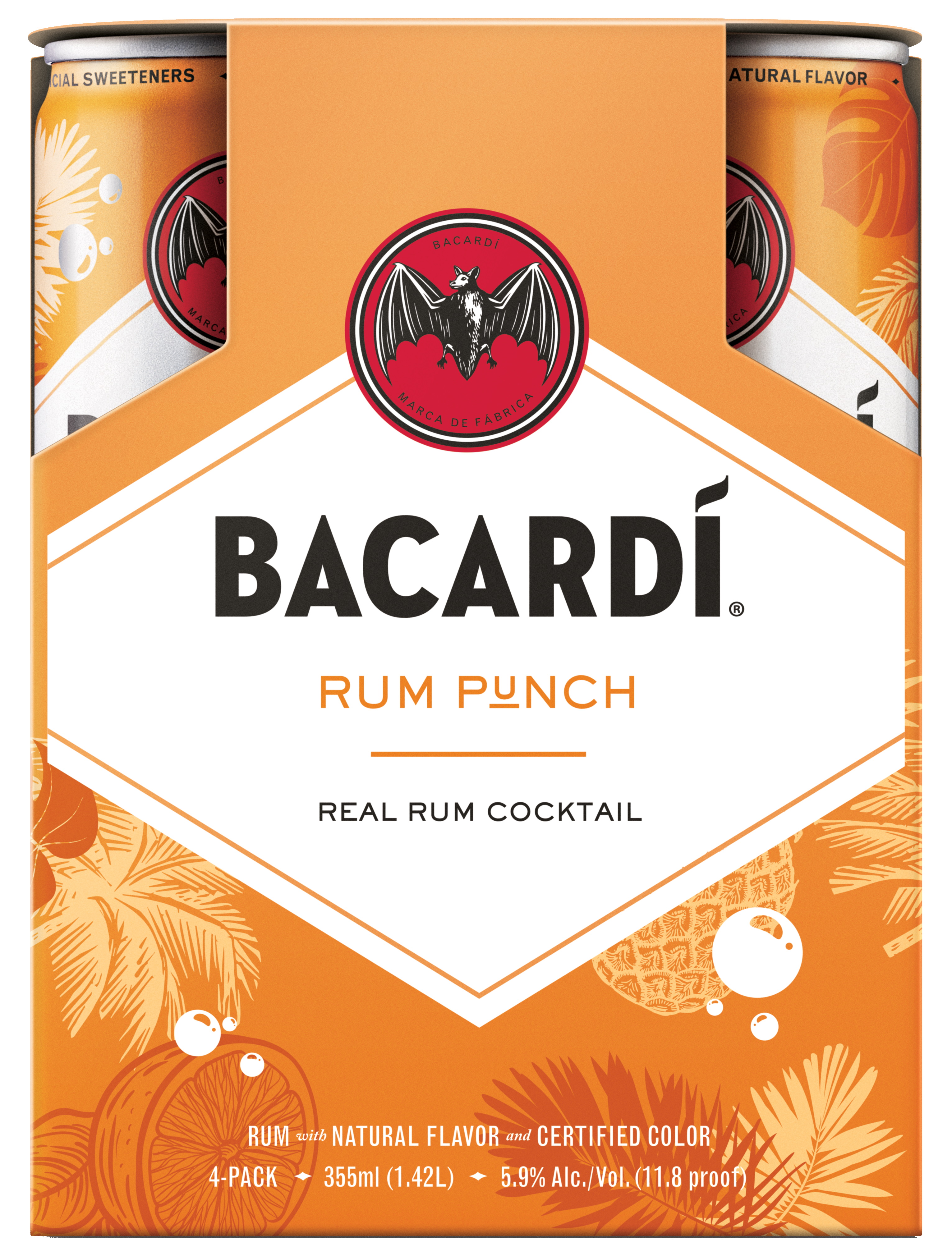 "Ready-to-drink cocktails in a can. Made with BACARDÍ Superior Rum, all natural flavors, real ingredients (cane sugar, natural juices or concentrates), and no artificial sweeteners. A Caribbean sunset in a can offering a unique blend of naturally fresh pineapple, sweet orange, and ripe mango flavor with a hint of passionfruit." Tasting Notes