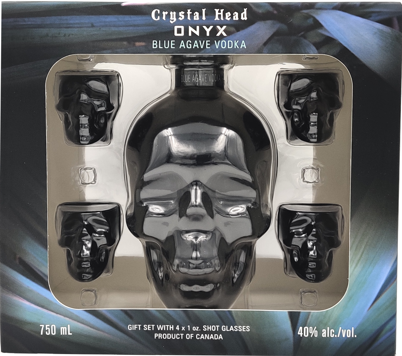 "Comes in a glossy black bottle with a matching crest debossed cap, a reference of the warrior crystal: Onyx. Made with Blue Weber Agave sourced from a single farm in Mexico, Onyx is blended with water from Newfoundland, Canada, and filtered through over 10,000 Herkimer diamonds, giving the final product a clean and semi-sweet finish. It does not contain any oils, sugars or additives. " Tasting Notes Gift set includes one 750ml bottle and four skull shot glasses.