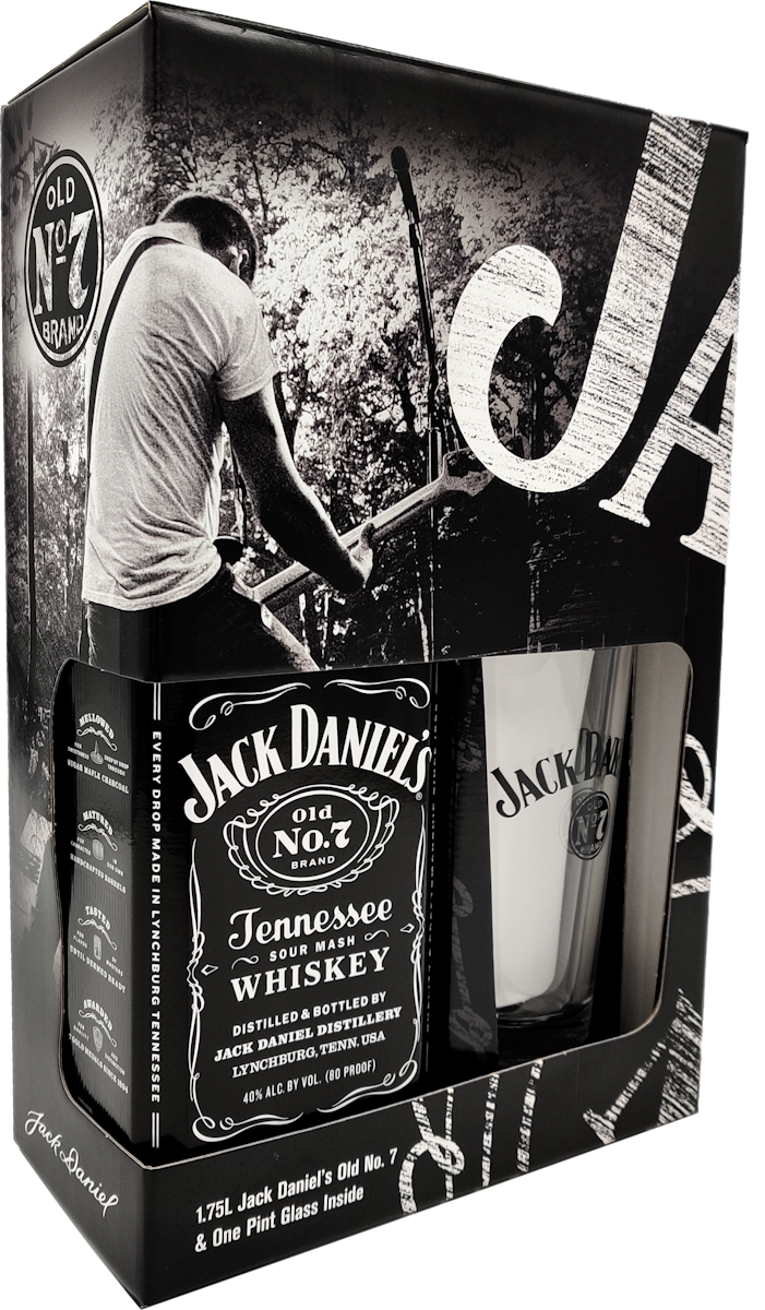 This gift set contains one 1.75L bottle of Jack Daniel's and one pint glass. "Well-rounded and balanced whiskey with a pleasant mix of caramel, vanilla, and wood notes highlighted by a slightly fruity aroma. Consistent taste from bottle to bottle." Tasting Notes