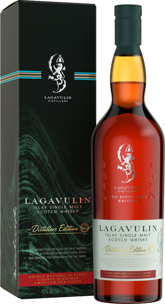 "This unforgettable Distillers Edition of Lagavulin delivers an extra rich raisin-sweet flavour, with a dark smokiness that intensifies as the peat grows." Producer Notes