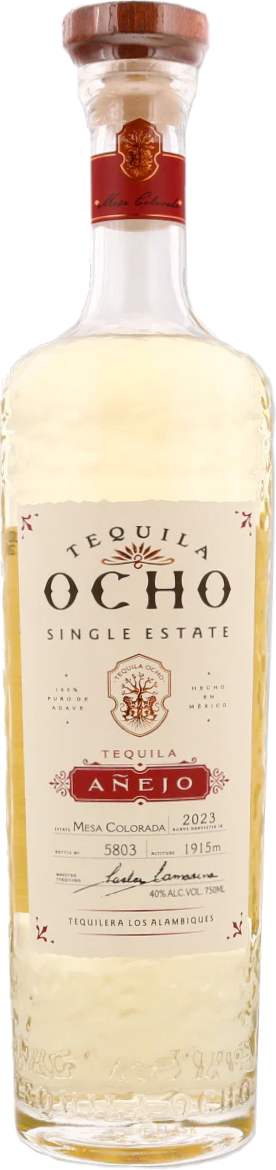 Every bottle of Ocho Tequila is marked with the year of production, as well as the estate or "rancho", from which the agaves come, not unlike fine wines. This makes the bottles highly collectible. Ocho Añejo has been aged in ex-American Whiskey barrels for one year and is made from 100% blue agave, then bottled at 80 proof.