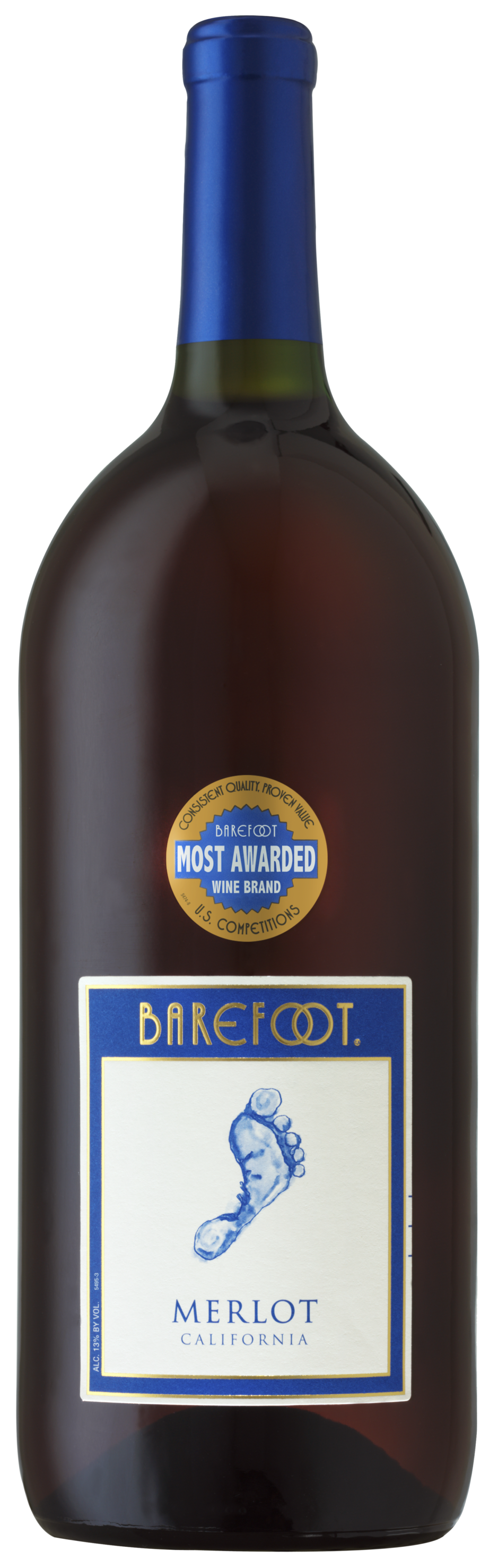 "This classic red wine varietal is well known for its rich personality and taste. Barefoot Merlot is the perfect combo of cherry, boysenberry, plum, and chocolate. A mocha finish is complemented by hints of smoky vanilla oak. Raised right, it's well rounded with mild tannins. Pairs well with hearty tomato-based dishes, red meats, poultry, and chocolate desserts." Winemaker's Notes